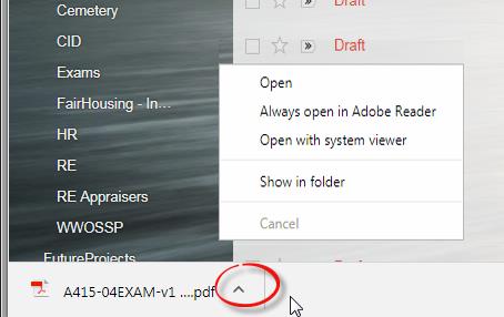 Una vez que haga clic en el botón 'descargar', el archivo adjunto se colocará en la parte inferior de su navegador. Haga clic en la flecha (no en el nombre del archivo) y verá las opciones para abrir el archivo.
