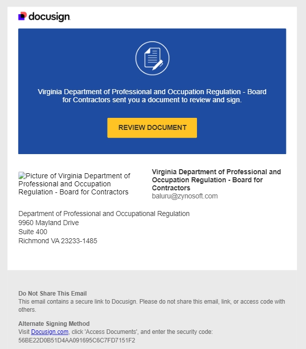 ACTUALIZACIÓN 11/8/2024: DPOR ha recibido múltiples informes de mensajes fraudulentos de DocuSign que parecen originarse en la Junta de Contratistas de DPOR (ver imagen de referencia). Si ha recibido este correo electrónico, elimínelo, no lo responda directamente y no haga clic en ningún enlace del mensaje. Consulte las instrucciones a continuación para autenticar cualquier mensaje que parezca originarse en DPOR. En caso de duda, comuníquese con nosotros para confirmar la legitimidad de las comunicaciones de la agencia.
